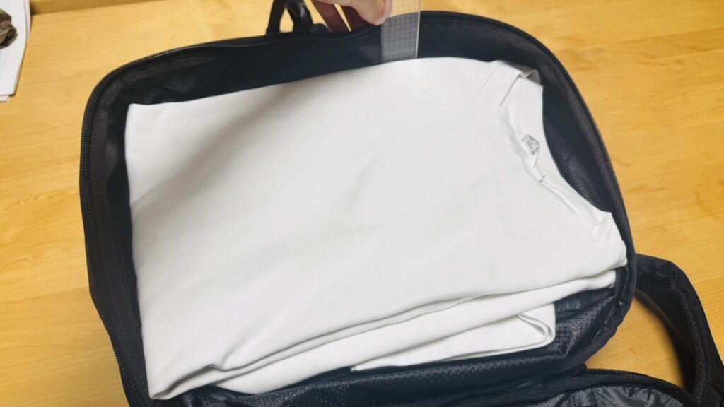 Tシャツ約12枚収納可能。高さは実測で8cmほど。夏場なら二泊三日程度の着替えも余裕です